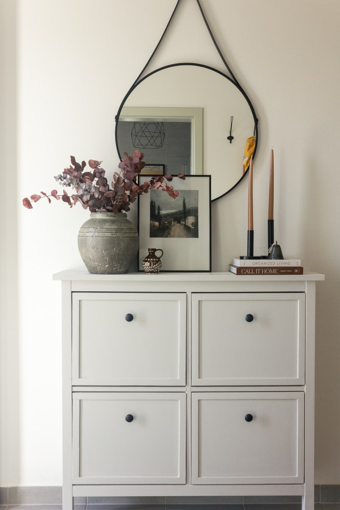 As the days get shorter, lighting becomes even more important in creating a cozy atmosphere. For my entryway, I added a few candlesticks. A small table lamp with a warm-toned bulb adds ambient lighting to keep the space well-lit and inviting too.