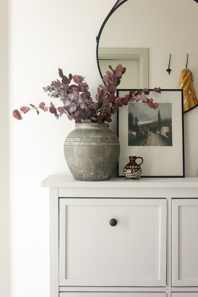 Fall is the perfect season to bring in elements from nature. In my entryway, I used dried red eucalyptus branches in a vase to give a soft nod to the harvest season without overwhelming the space. Using neutral-colored pumpkins is another great idea to incorporate in this area.