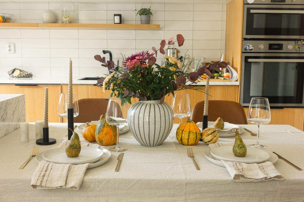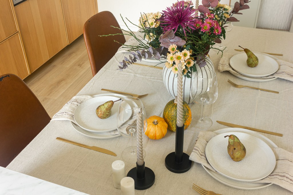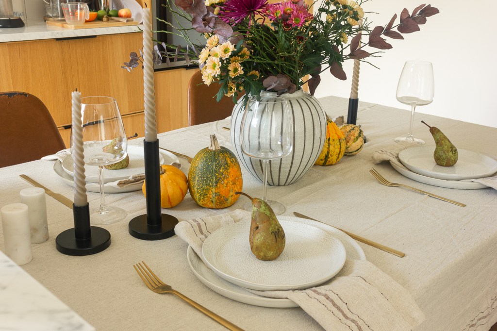If you’re hosting this year and looking for a few items to elevate your table, I highly recommend starting with neutral basics and adding in seasonal details like pumpkins, candles, or even quirky personal touches like pears.